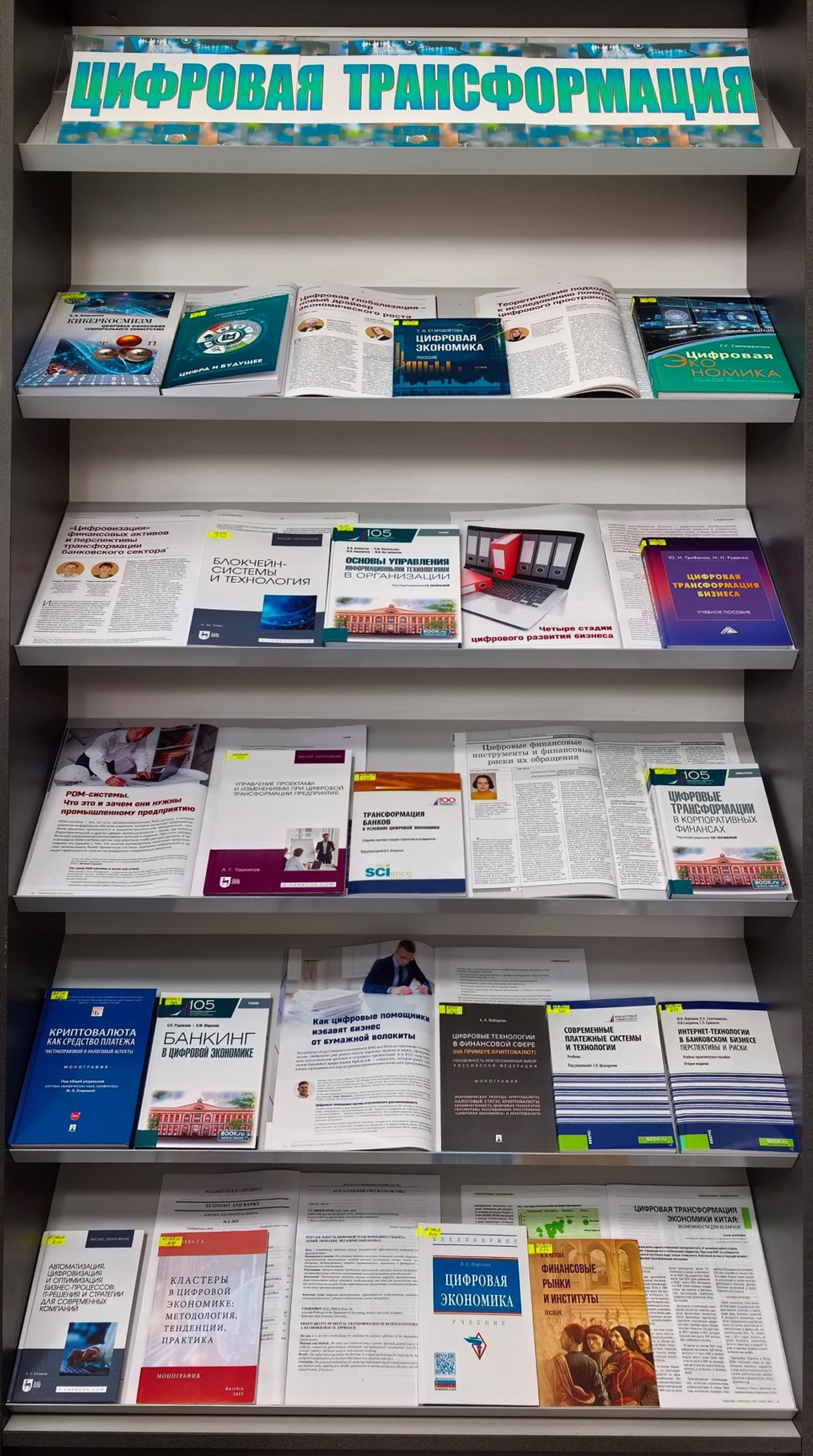 Для карыстальнікаў, якія цікавяцца пытаннямі цыфравізацыі, арганізавана кніжна-часопісная выстаўка “Лічбавая трансфармацыя”, якая экспануецца ў чытальнай зале бібліятэкі навучальнага корпуса №1. Яна дае ўяўленне аб лічбавай эканоміцы і звязаных з яе развіццём тэхналогіях. У выданнях, прадстаўленых на выстаўцы, разглядаюцца пытанні цыфравізацыі ў розных галінах эканомікі, прыводзіцца сусветны вопыт прымянення лічбавых тэхналогій, аналізуюцца магчымыя рызыкі і перспектывы лічбавага грамадства.