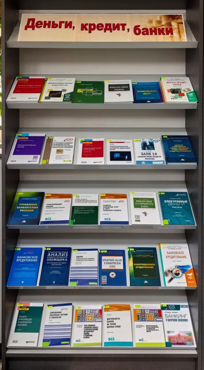 У чытальнай зале бібліятэкі навучальнага корпуса №1 арганізавана кніжная выстаўка “Грошы, крэдыт, банкі”. На ёй прадстаўлена навуковая, навучальная і вучэбна-метадычная літаратура, у якой разглядаюцца пытанні, якія раскрываюць сутнасць грашовых і крэдытных адносін у грамадстве: гісторыя з'яўлення і сутнасць грошай, крэдыту і банкаў; пабудова грашовых сістэм, арганізацыя грашовага абарачэння і разлікаў у сучаснай эканоміцы; тэарэтычныя аспекты арганізацыі крэдыту і крэдытных адносін у грамадстве; гісторыя станаўлення і асаблівасці пабудовы сучаснай банкаўскай сістэмы; сутнасць і аперацыі сучасных банкаў і нябанкаўскіх крэдытных арганізацый; асновы арганізацыі валютных рынкаў і міжнародных валютна-крэдытных адносін; паняцце, віды, характарыстыка сучаснага рынку каштоўных папер, яго ўдзельнікаў і інструментаў, якія выкарыстоўваюцца.