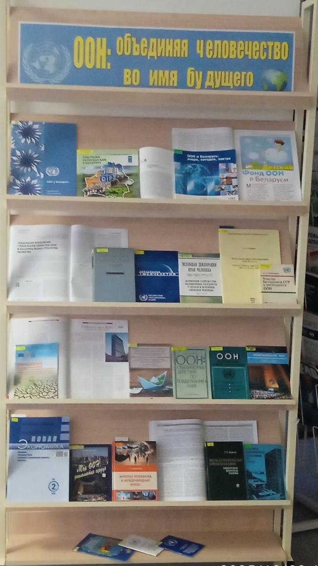 Чытальная зала бібліятэкі (навучальны корпус № 3, вул. Пушкіна, 4, аўд. 3332) запрашае на кніжную выставу “ААН: аб'ядноўваючы чалавецтва ў імя будучыні”, прысвечаную юбілею Арганізацыі Аб'яднаных Нацый (ААН).