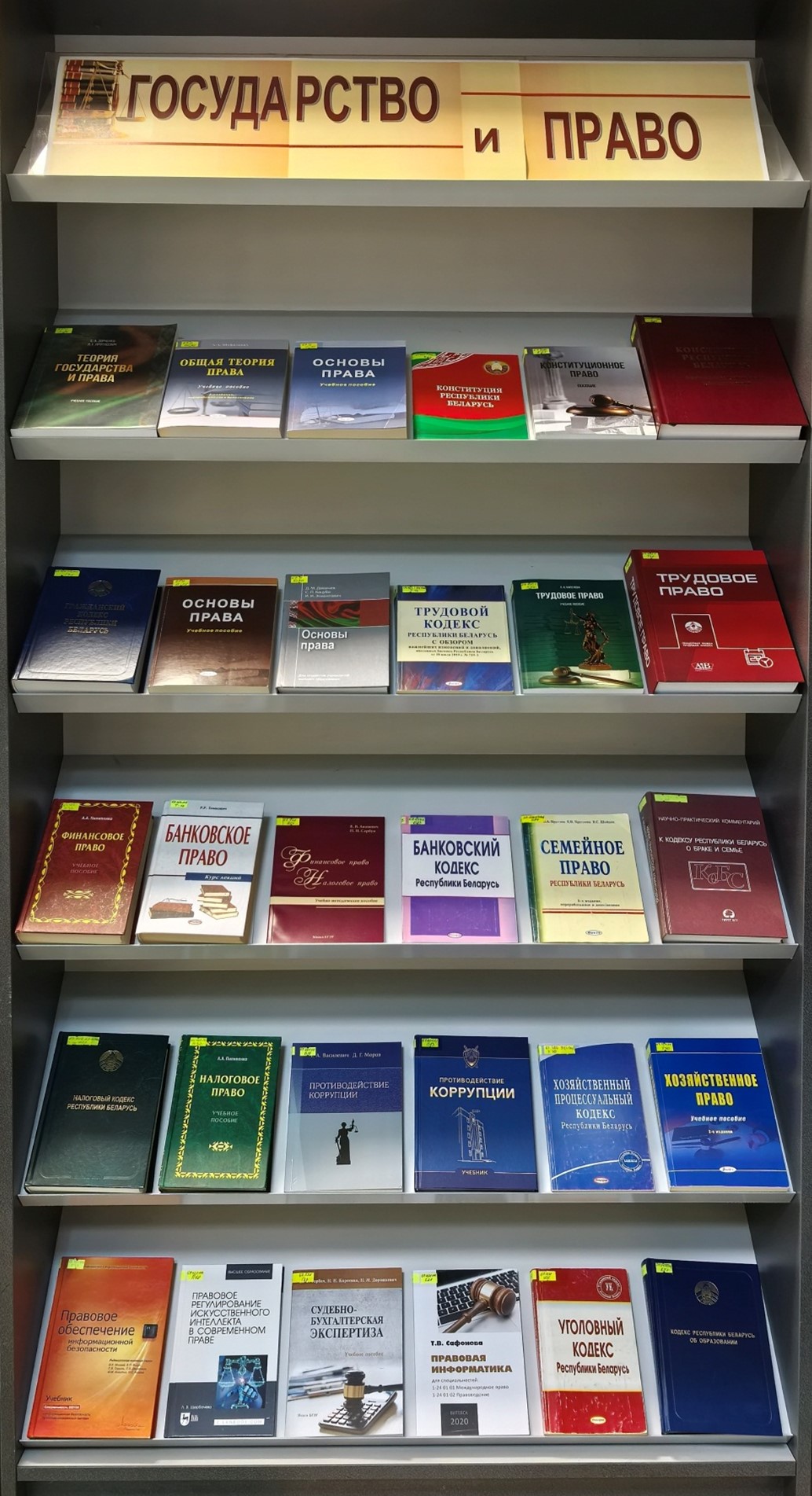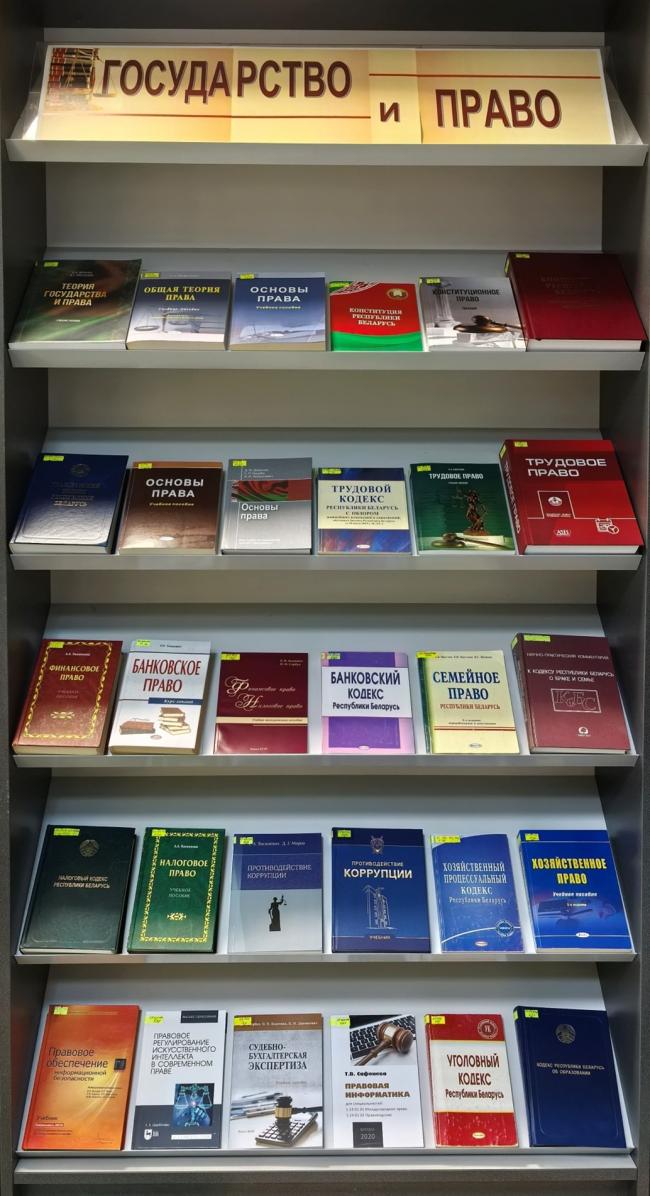 Як навучыцца карыстацца сваімі правамі і абавязкамі? Дзе даведацца якімі правамі мы валодаем? Чаму ў нас ёсць не толькі правы, але і абавязкі? Якія прававыя акты ахоўваюць і абараняюць нас? Знайсці адказы на гэтыя і многія іншыя пытанні дапаможа кніжная выстаўка “Дзяржава і права”, якая экспануецца ў бібліятэцы навучальнага корпуса №1. На ёй прадстаўлены падручнікі па тэорыі айчыннай дзяржавы і правы, літаратура па канстытуцыйным, грамадзянскім, сямейным, працоўным, фінансавым, гаспадарчым праве.